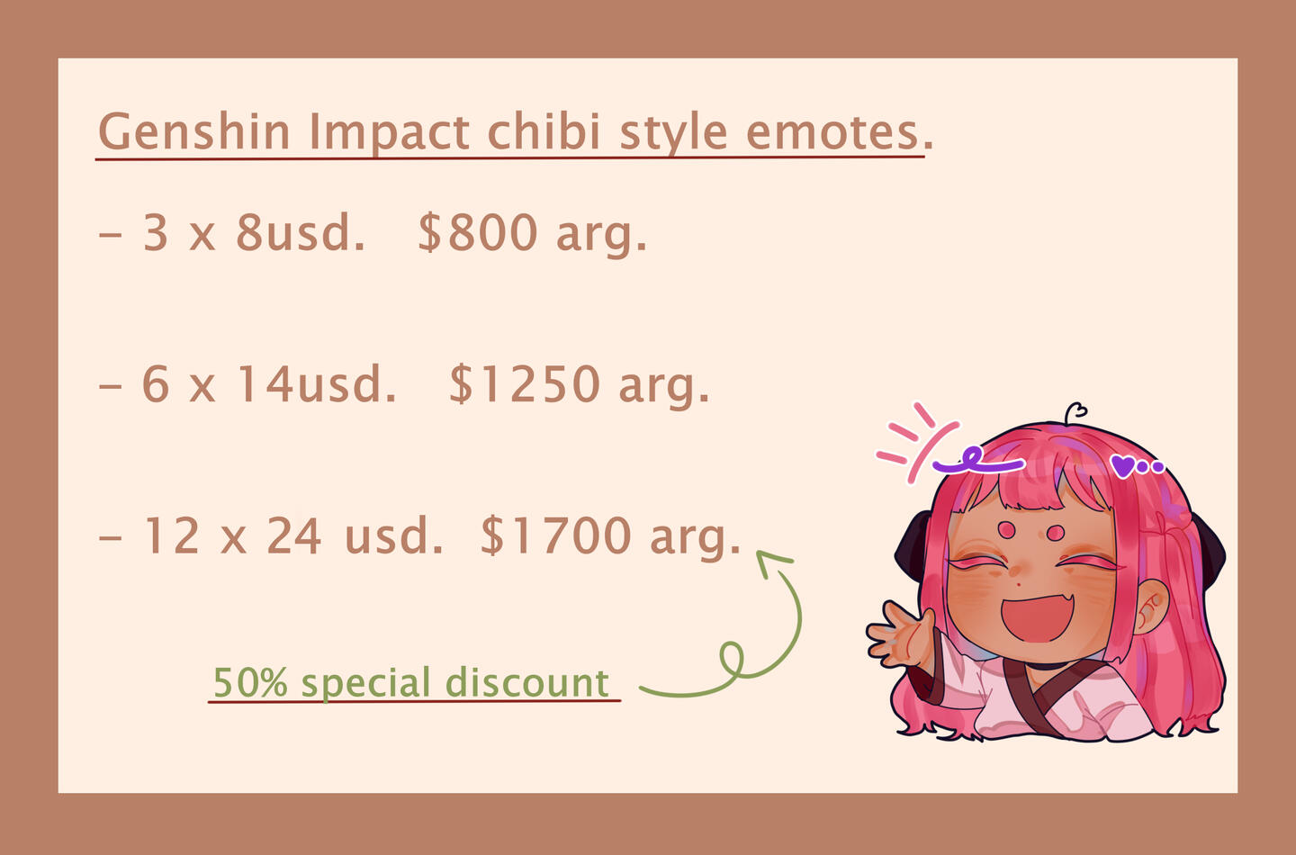 what i offer? right now, im doing genshin chibi style emotes, icon headshots and sheet reference of your ocs!